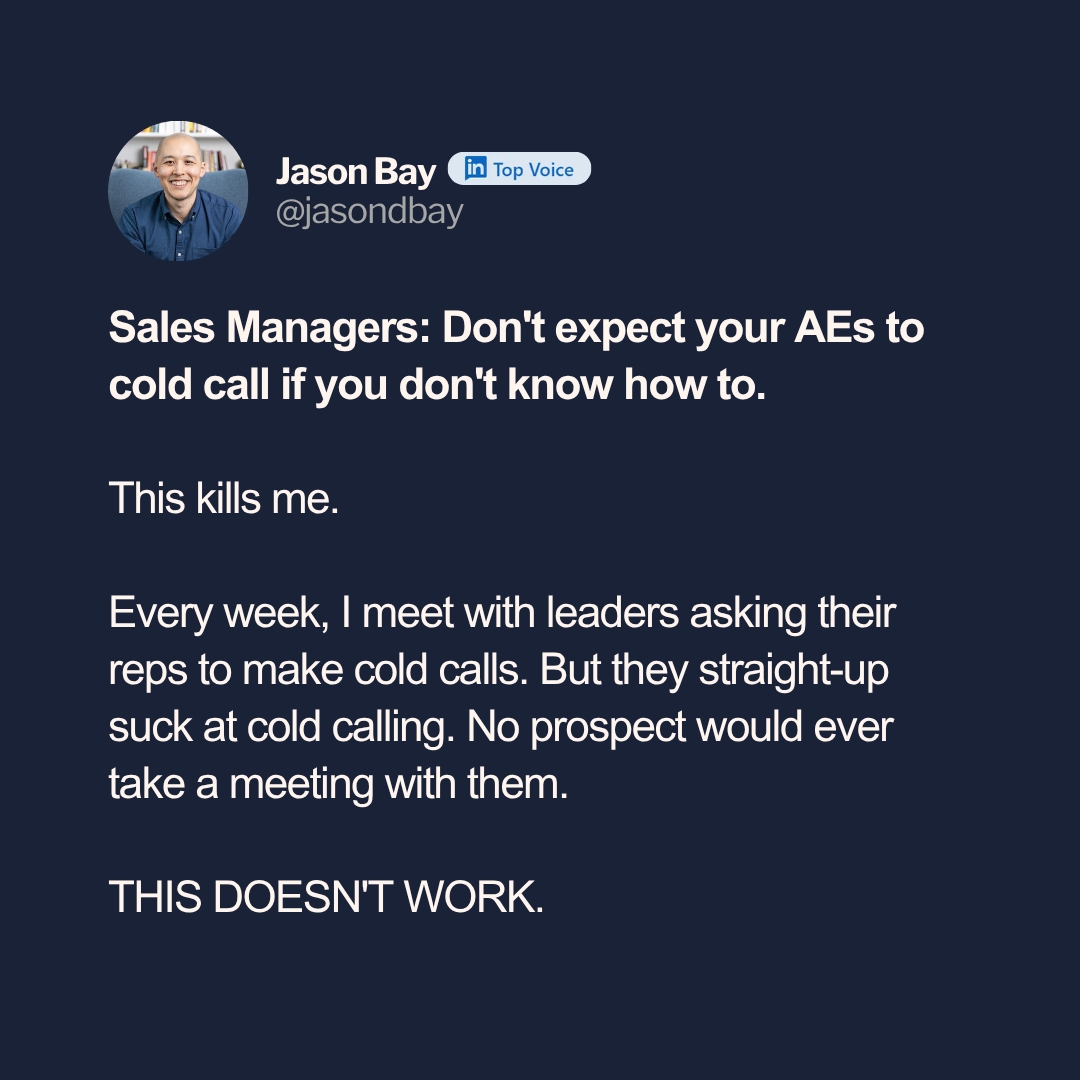 Every week, I meet with leaders asking their reps to make cold calls. But they straight-up suck at cold calling. No prospect would ever take a meeting with them.